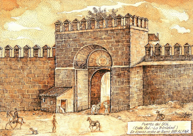 A través de diversos grabados realizados por Richard Ford entre 1839 y 1833 se tiene constancia que el frontispicio del arco de acceso contaba con un gran relieve de piedra que representaba al sol. Este hecho vendría también a justificar el nombre de la puerta. Como se observa en estos grabados, la puerta tendría unas dimensiones considerables, singularizada por su elevada altura. En origen, respondería a una tipología de torre-puerta con acceso en recodo y protegida por la barbacana. Según la descripción de Morgado y Hoefnagle, la torre sería una de las más altas de toda la ciudad.