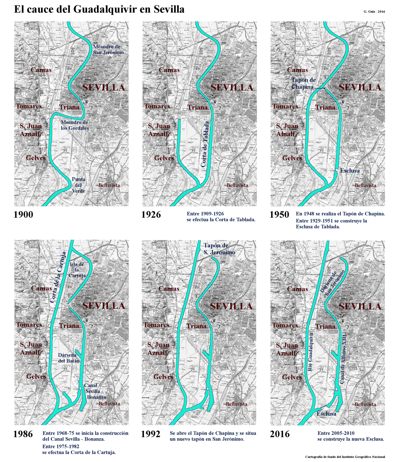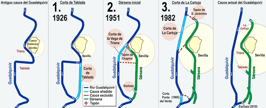 El segundo supuso la apertura del nuevo cauce entre la Cartuja y San Juan de Aznalfarache y el cerramiento del canal de Alfonso XIII mediante la esclusa, con la que el río se convierte en dársena.