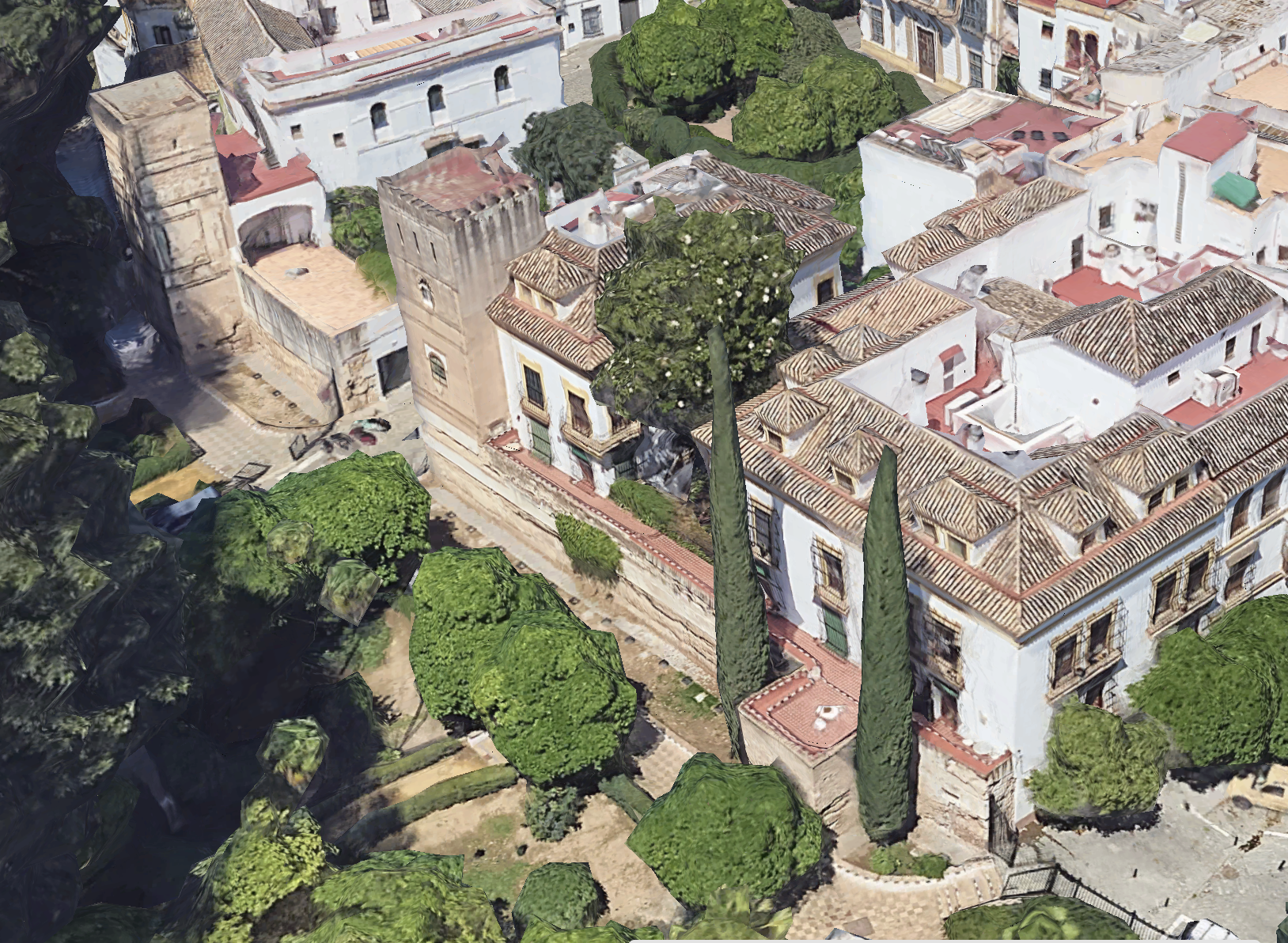 > Torre (1): está virtualmente completa e incluso recrecida, tiene una altura total de 15 m. su base es la base maciza habitual de las torres del amurallamiento sevillano, que llega desde el actual suelo de los jardines a la cota del adarve del muro. La torre posee tres cámaras de las cuales la superior aparenta ser moderna, pues es de ladrillo sobre un zócalo de tapial que debe ser el parapeto de azotea medieval.