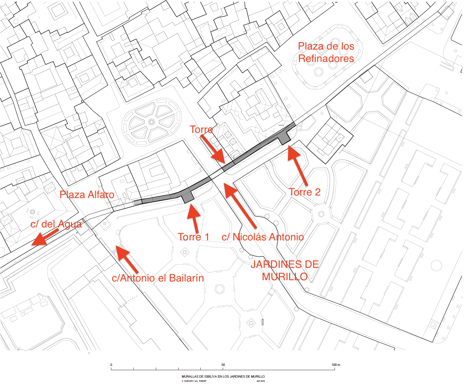 Los lienzos de los Jardines de Murillo comienzan en la plaza de Alfaro y concluyen en la plaza de Refinadores, lo que supone un trayecto de unos cien metros, entrecortados por la calle Nicolás Antonio, que fue abierta en 1911 a costa de cortar directamente la muralla que, por cierto, está muy soterrada.
