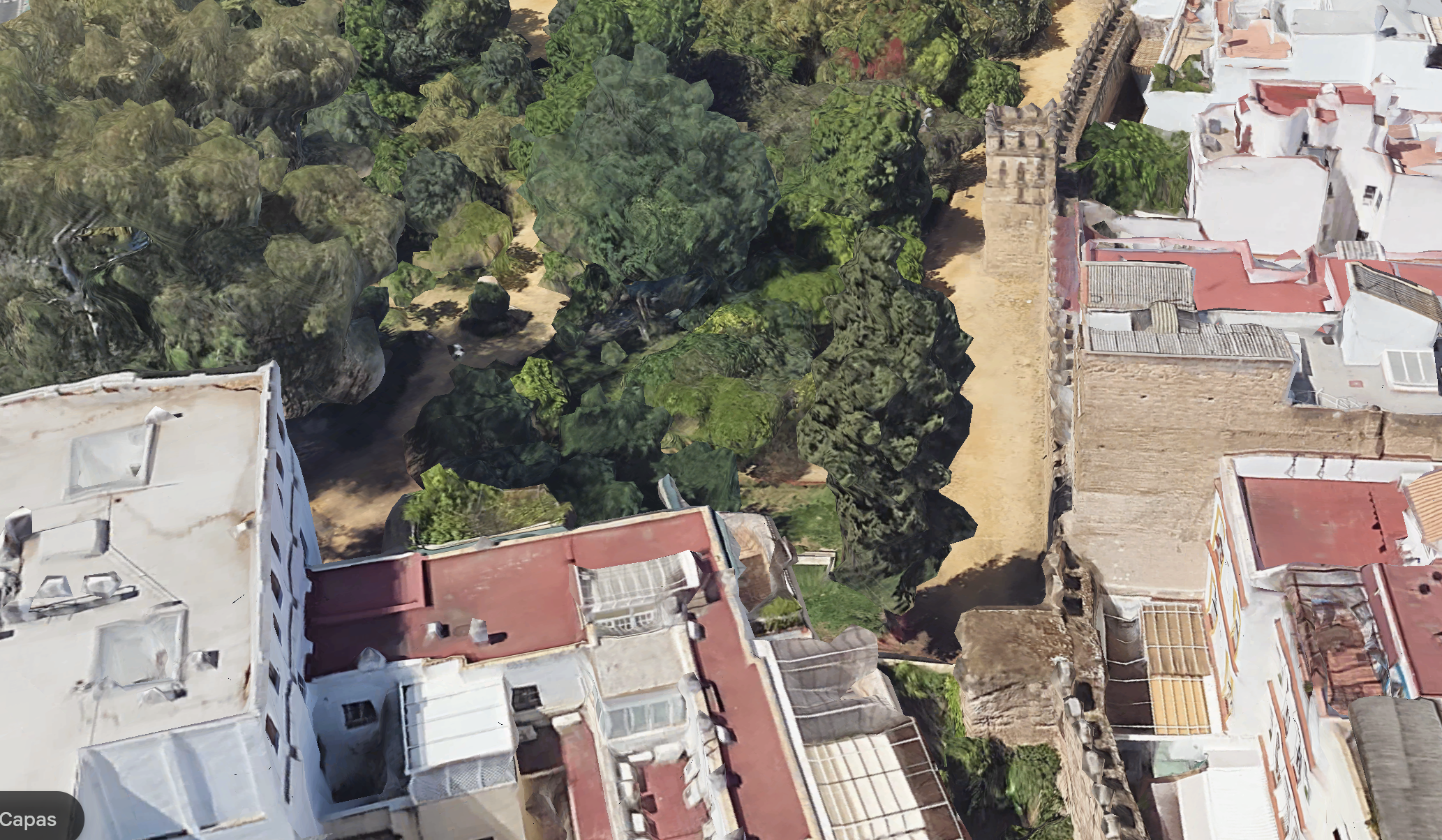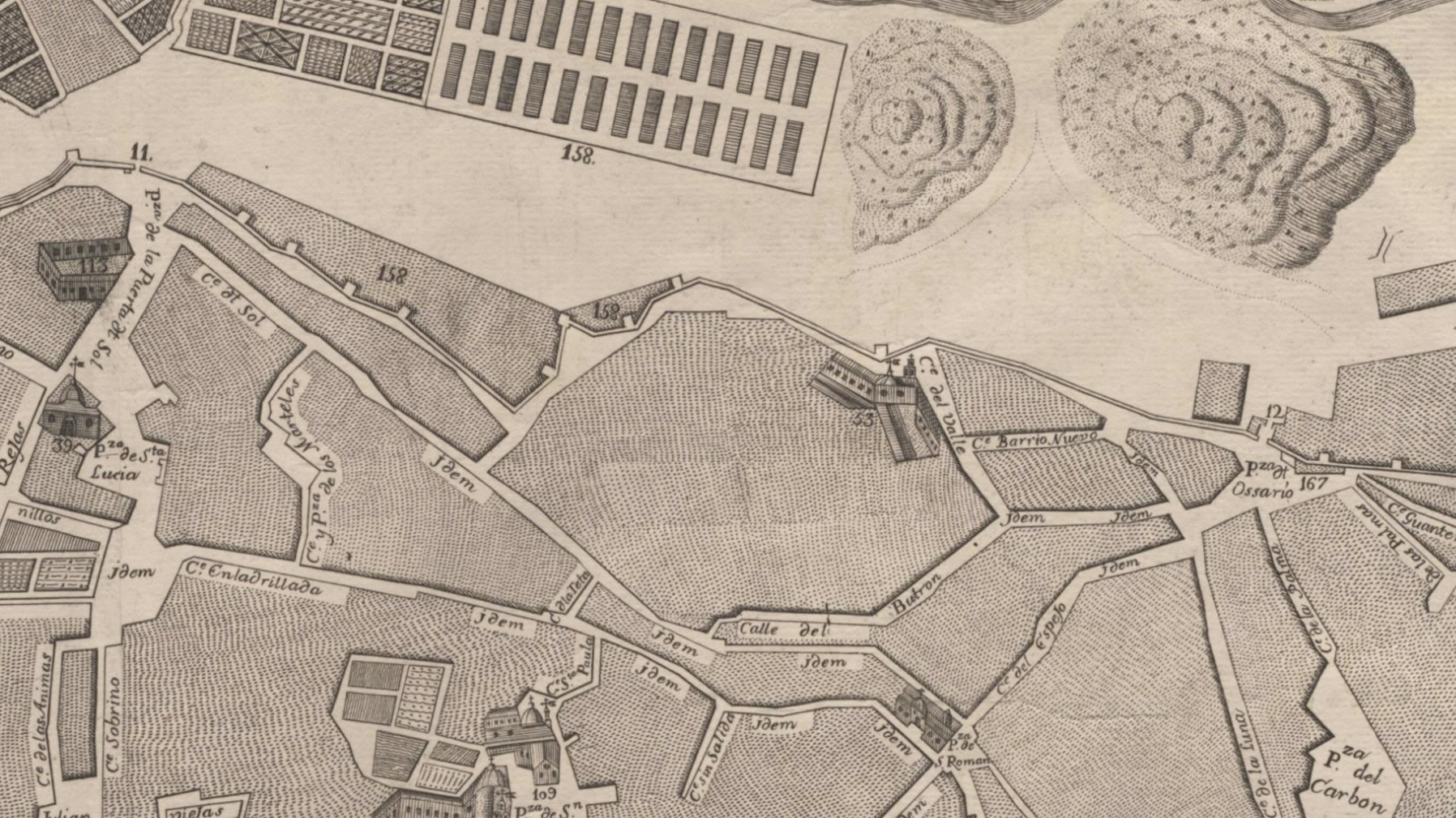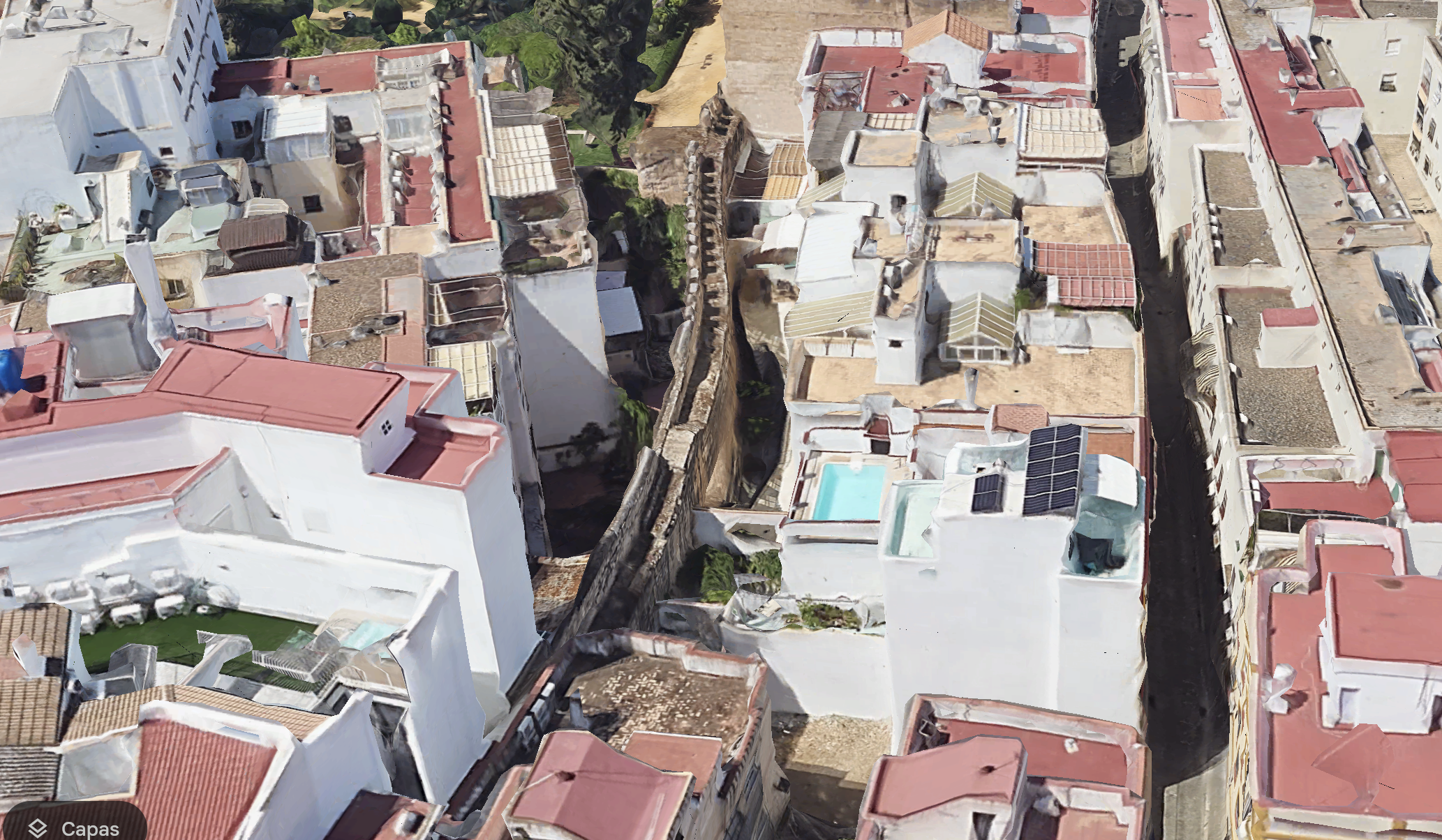 • Las otras dos, tras un quiebro saliente muy pronunciado, son rectas que formando un anómalo rincón en escuadra, cuyo primer lienzo es perpendicular a la calle más larga y artificiosa del recinto medieval, la del Sol, y el otro paralelo y medianero a los números pares de la misma.
