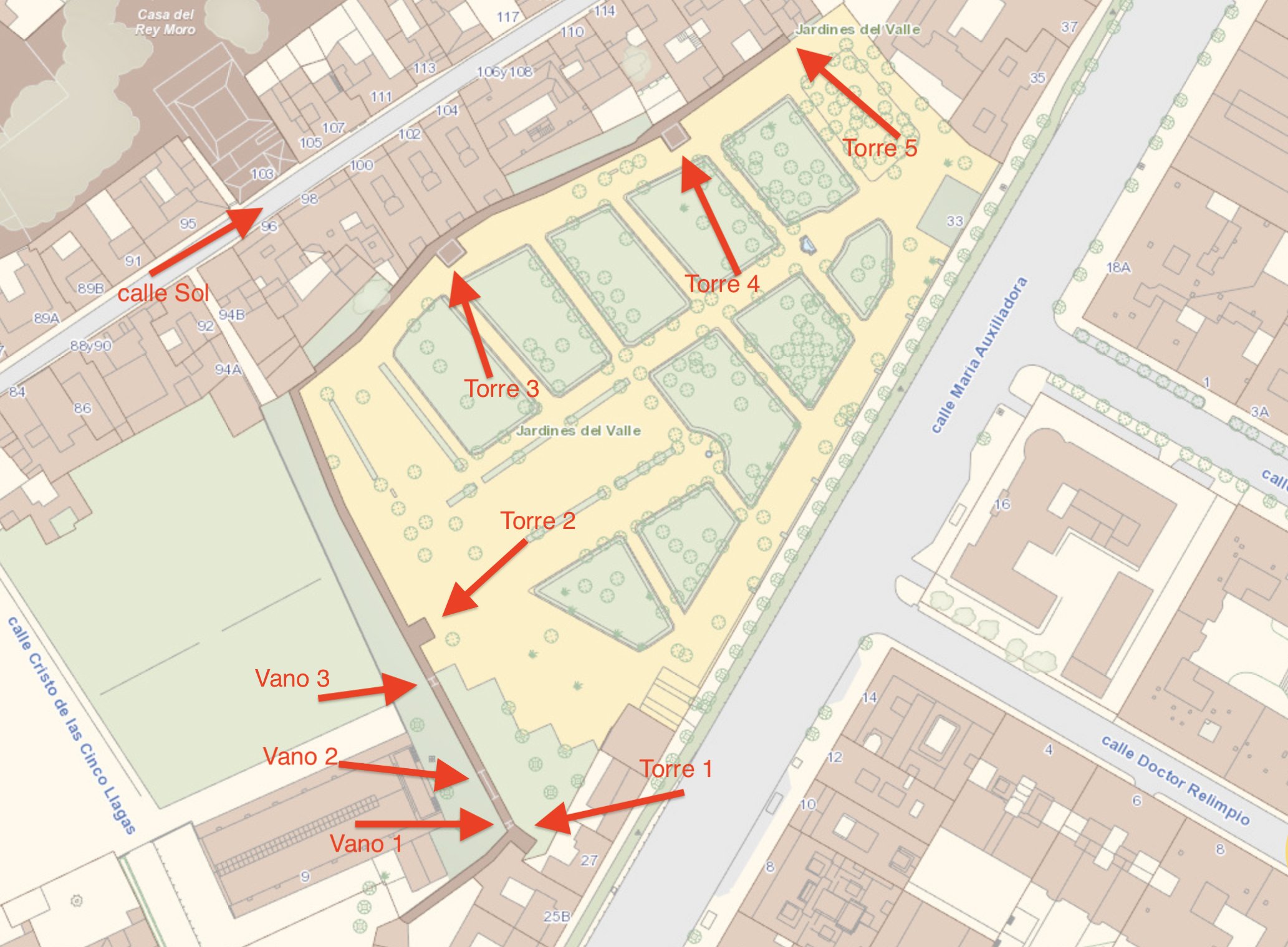 […] Los Jardines del Valle, con sus 225 metros de muralla conservada, están a unos 80m de esta ubicación, y se salvaron de los derribos durante La Gloriosa porque estaban en el interior del Colegio Sagrado Corazón. Desde los Jardines existen unos 55 metros más de muralla oculta entre las casas, que se quedan a escasos metros de la antigua Puerta del Sol. […]