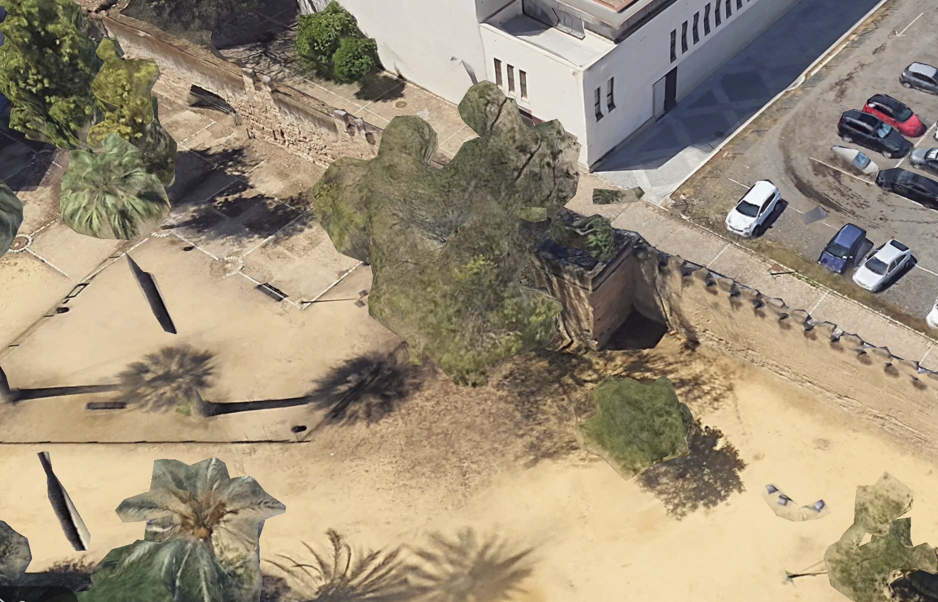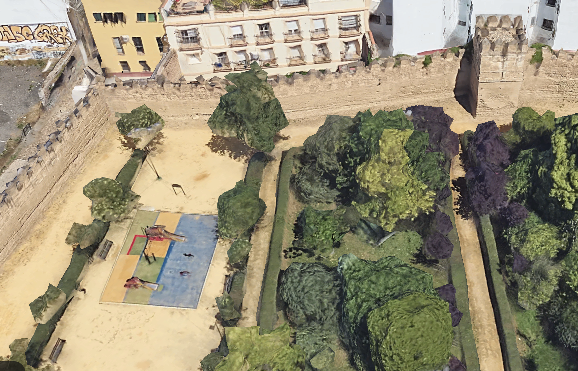 >En las obras de restauración de 1989 se rehízo la parte maciza de la Torre siguiente (2), cuyo cimiento se había exhumado en la excavación estratigráfica de 1986, que consistió en seis cortes repartidos en el contorno murado de estos jardines.