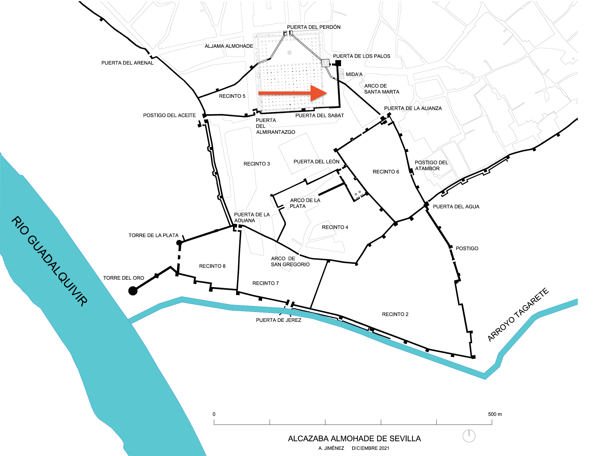 El espacio que ocupó el Corral de los Olmos había tenido su origen durante el siglo XII, cuando el califa Abu Yacub intentaba completar las construcciones del Alcázar interior y la Mezquita Aljama con un sistema de murallas que aislaran dichas edificaciones del resto de la ciudad. A su muerte, su hijo Abu Yusuf transformó los planes de su padre, realizándose sólo el tramo de ellas correspondientes al flanco oriental. Éste vendría desde la inflexión que hacía el muro de la alcazaba interior a terminar en las inmediaciones del palacio arzobispal, en donde, haciendo un quiebro en ángulo recto, enlazaba con el alminar mediante un arco de herradura, denominado posteriormente Puerta de Palos. El mencionado muro, junto con el de la alcazaba interior, el de la mezquita y la Puerta de Palos, rodearían el espacio que daría lugar al Corral de los Olmos, así llamado por los árboles que existieron en su interior.