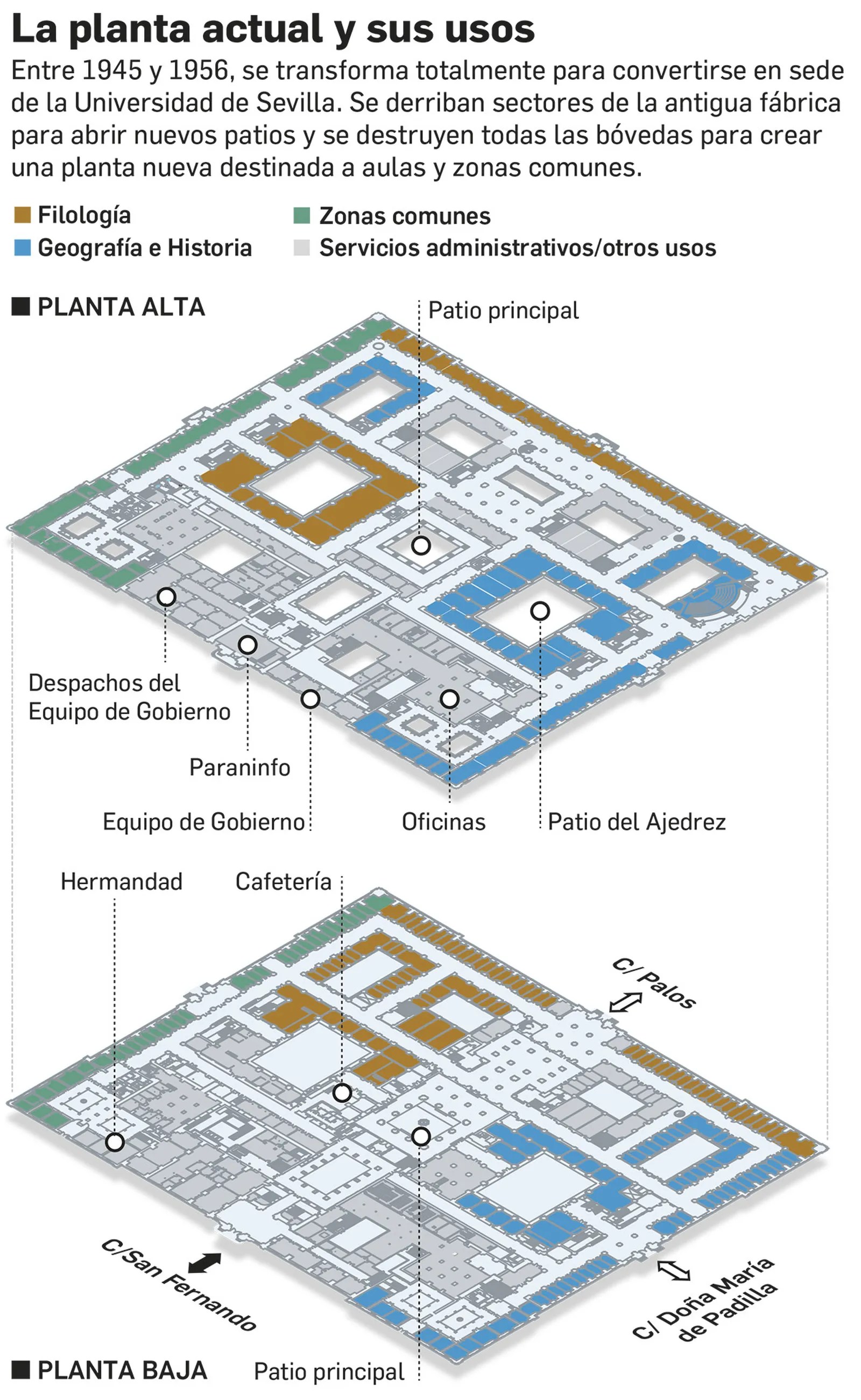 El traslado de la Universidad de Sevilla a este edificio se produjo de forma escalonada entre 1954 y 1956. La transformación del edificio supuso una obra de profundo calado a cargo de los arquitectos Alberto Balbontín de Orta, Delgado Roig y Toro Buiza.