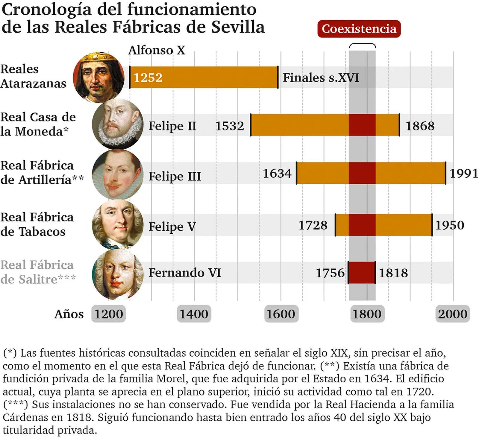Exceptuando a las Reales Atarazanas, las restantes reales fábricas de Sevilla, a pesar de la distancia temporal existente entre ellas, estuvieron en funcionamiento de manera simultánea durante unos 70 años, aproximadamente, entre el año 1750 y principios del siglo XIX.
