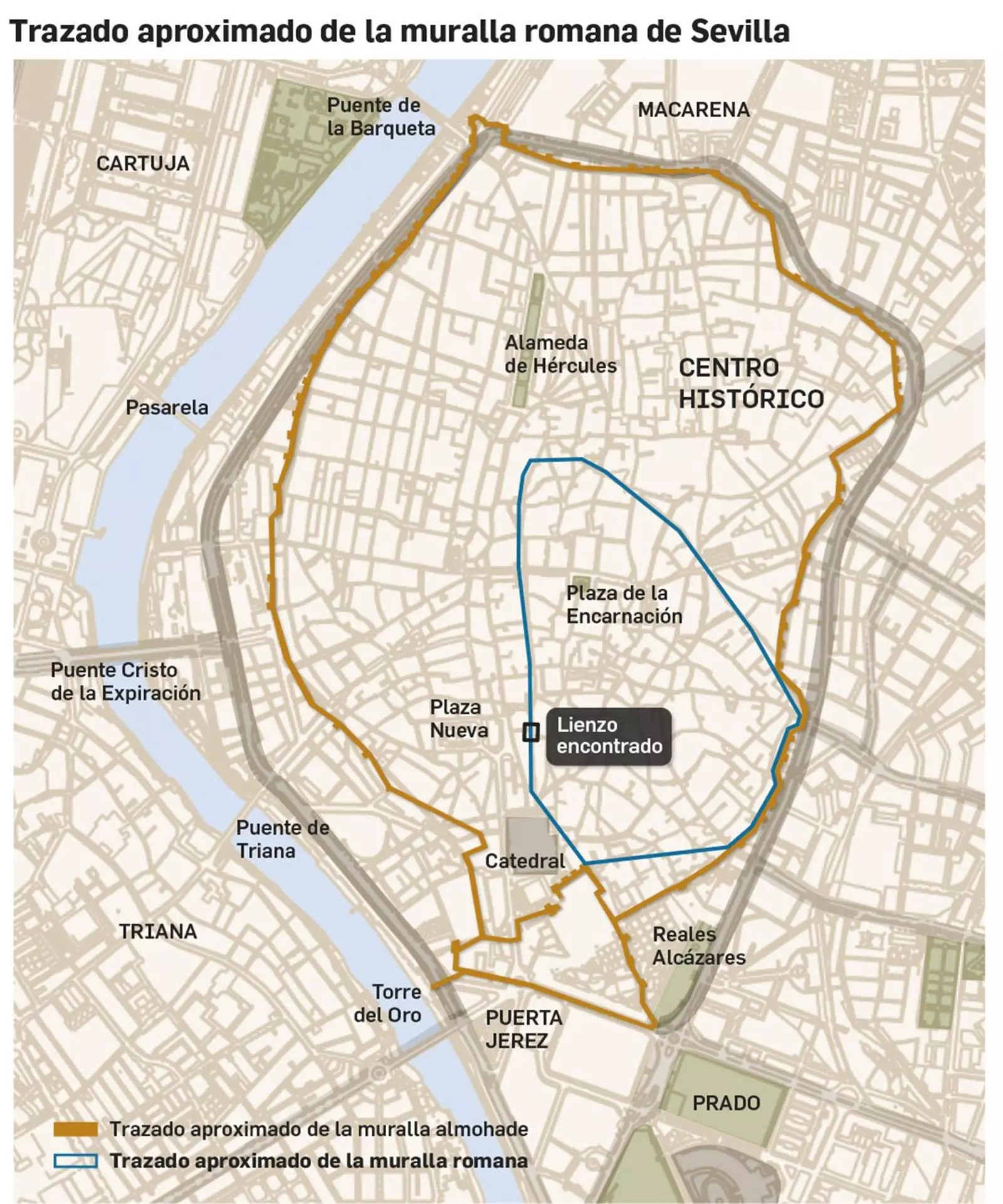 Si bien contamos con evidencias históricas de que Sevilla estuvo fortificada en época romana y que contó con una muralla perimetral, no hay datos que evidencien cuál fue el trazado exacto de dicha muralla.