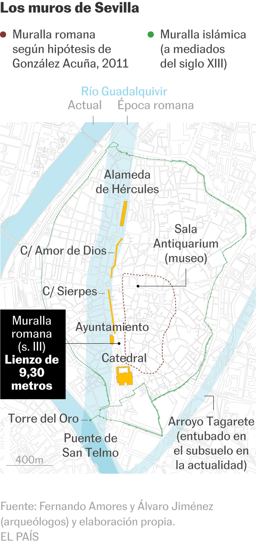 El cauce del Guadalquivir variaba según el nivel del mar y en época romana transcurría por las actuales Alameda de Hércules, calles Amor de Dios, Sierpes, plazas de San Francisco y Nueva y seguía hasta la desembocadura del arroyo Tagarete en la Torre del Oro. De forma que ambos cauces abrazaban Sevilla convirtiéndola prácticamente en una isla hasta que a mediados del XIX el Tagarete se abovedó en el subsuelo.
