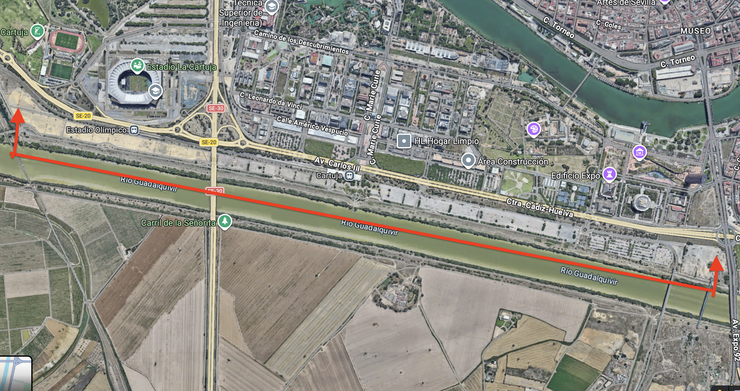 • Isla de la Cartuja y Avenida Carlos III: Durante la Exposición Universal de 1992, se construyó un tramo del muro de defensa paralelo a la nueva corta del río, protegiendo el recinto de la exposición y áreas adyacentes. Esta parte se encuentra junto a la Avenida Carlos III, en la Isla de la Cartuja, y cuenta con una superficie de aproximadamente 90.000 m².