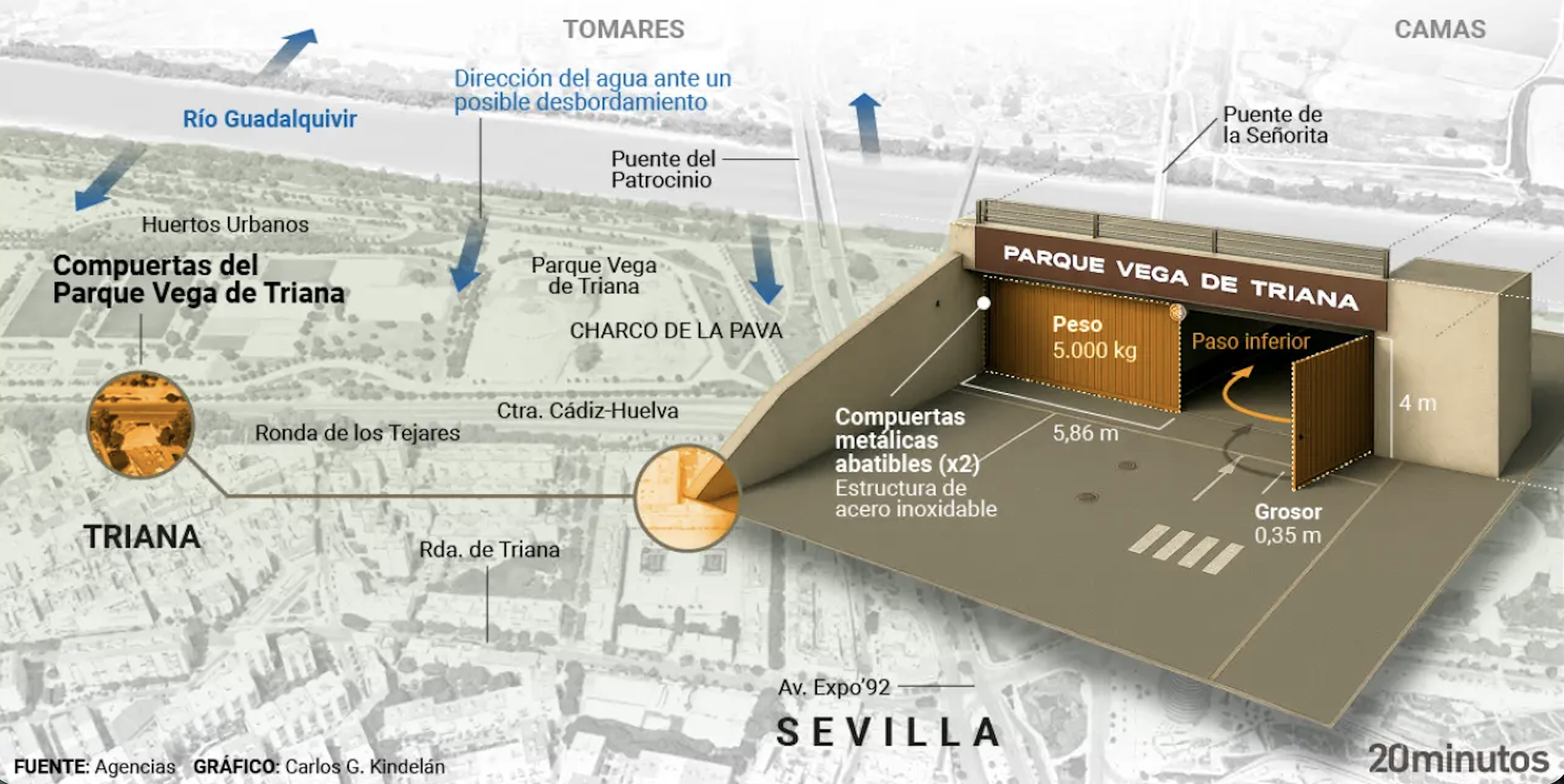 Estas infraestructuras para la defensa contra las crecidas del Guadalquivir, se adaptaron a las exigencias del crecimiento urbano y el cambio climático y no solo cumplen una función hidráulica, sino que también se ha integrado en el paisaje de la ciudad, con taludes verdes y paseos peatonales.