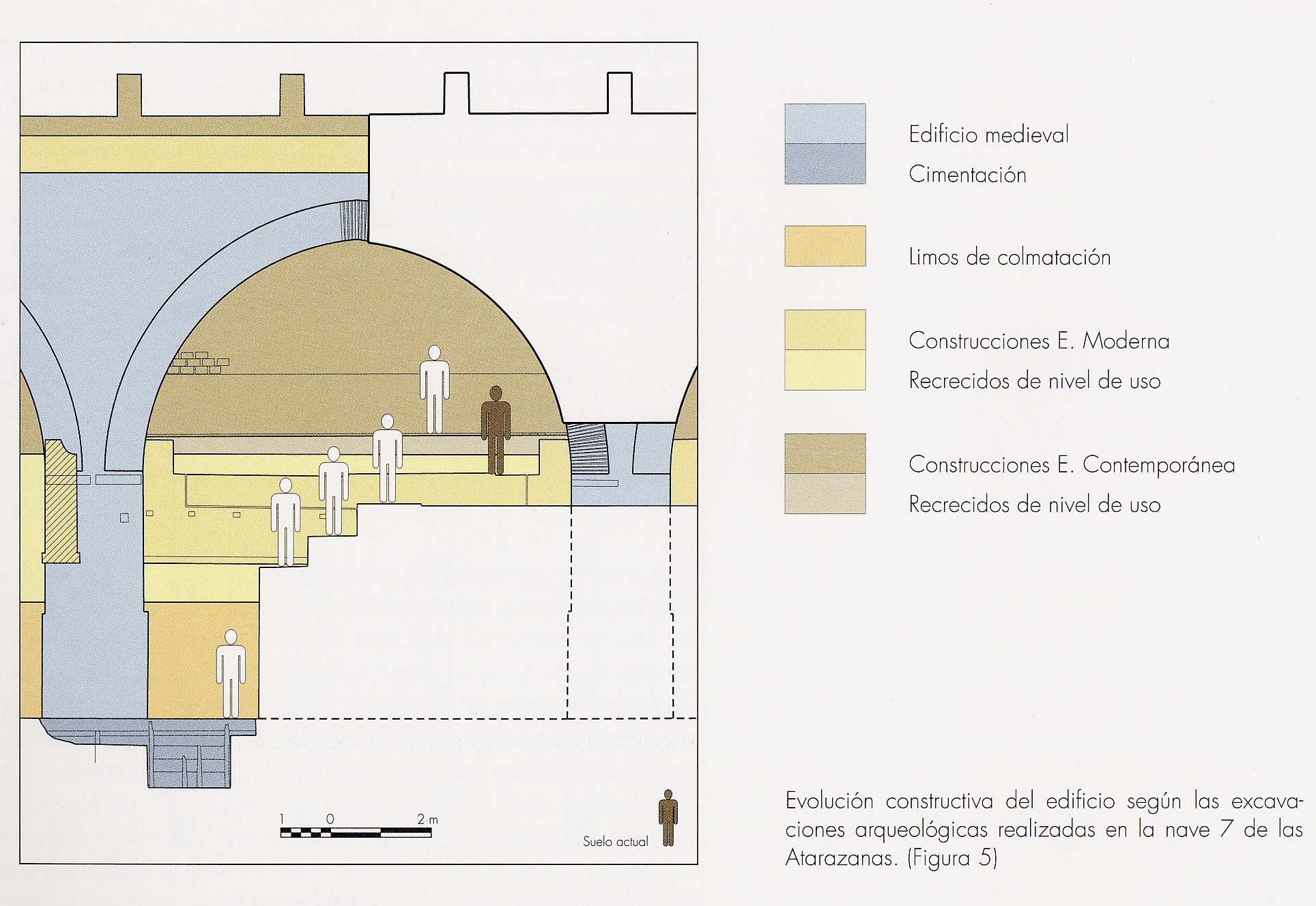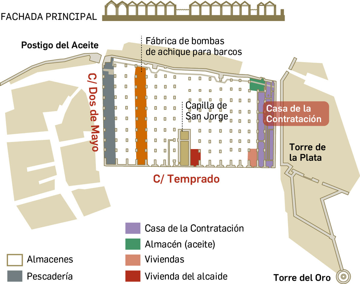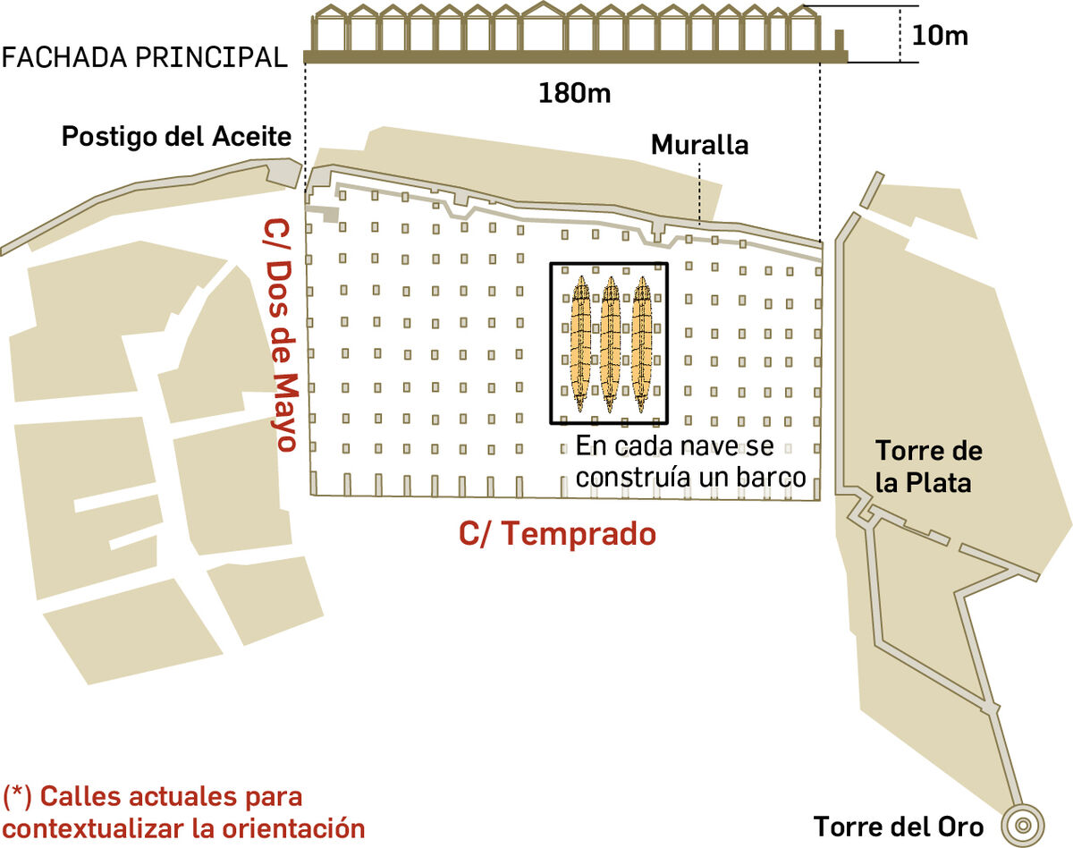 Las 7 naves que quedan en pie son una muestra del potencial de la época, siendo los astilleros medievales más antiguos y de mayor dimensión de su época. Sorprende saber que el suelo interior del edificio actual no es el original, sino que es el resultado de las sucesivas riadas del Guadalquivir y que enterrada se encuentra una longitud igual a la que se eleva desde la cota existente. Las excavaciones arqueológicas han dejado a la vista la cota original en la zona de estudio.