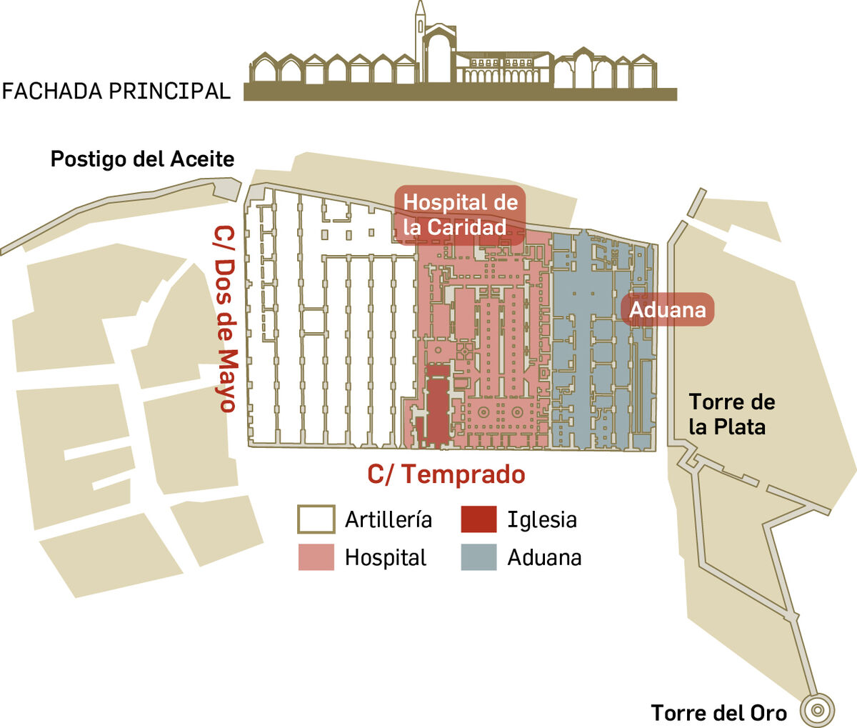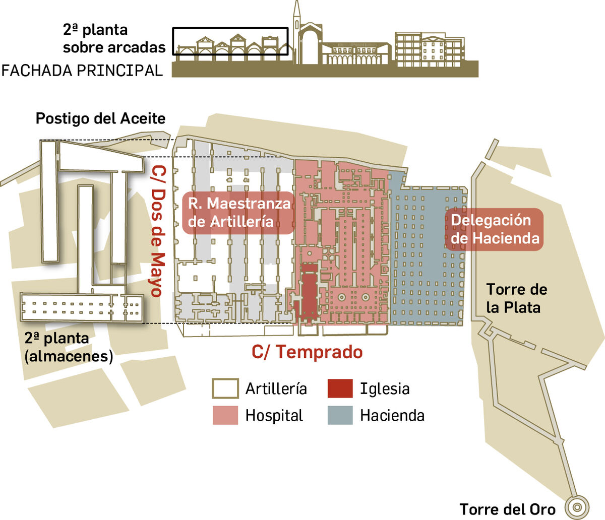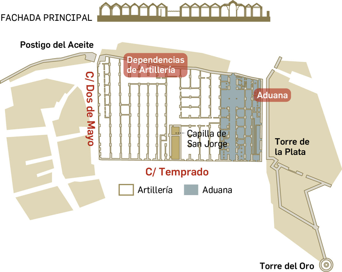 • Desde el siglo XVIII hasta el XX alojó la Real Maestranza de Artillería (naves 1 a 7), habilitándose como almacenes las bóvedas de las naves 2, 4 y 6. La Aduana (naves 13,14 y 15), ya en desuso, fue demolida en 1940 para construir la Delegación de Hacienda.